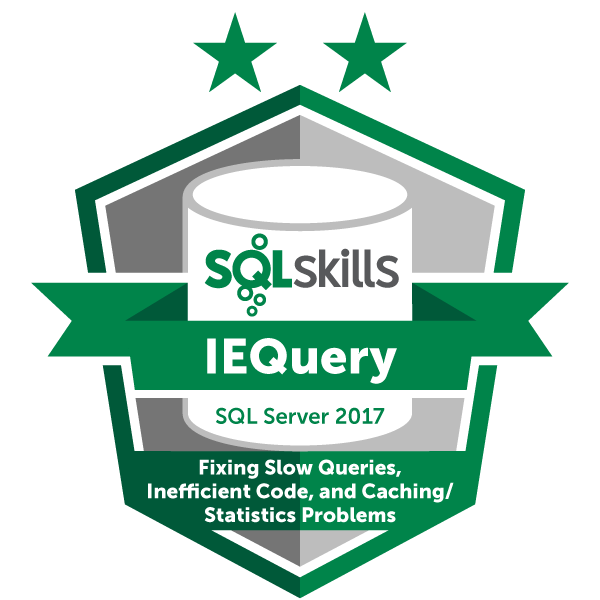 This badge shows attendance of the SQLskills Immersion Event on Fixing Slow Queries, Inefficient Code, and Caching/Statistics Problems. IEQuery gives everyone that works with SQL Server a better understanding of how to analyze and troubleshoot poor query performance. Part I: Capturing Query Information and Analyzing Plans by Erin Stellato. Part II: Removing Anti-Patterns in Transact-SQL by Jon Kehayias. Part III: Differentiating Caching / Statistics problems and SOLVING THEM by Kimberly Tripp.
